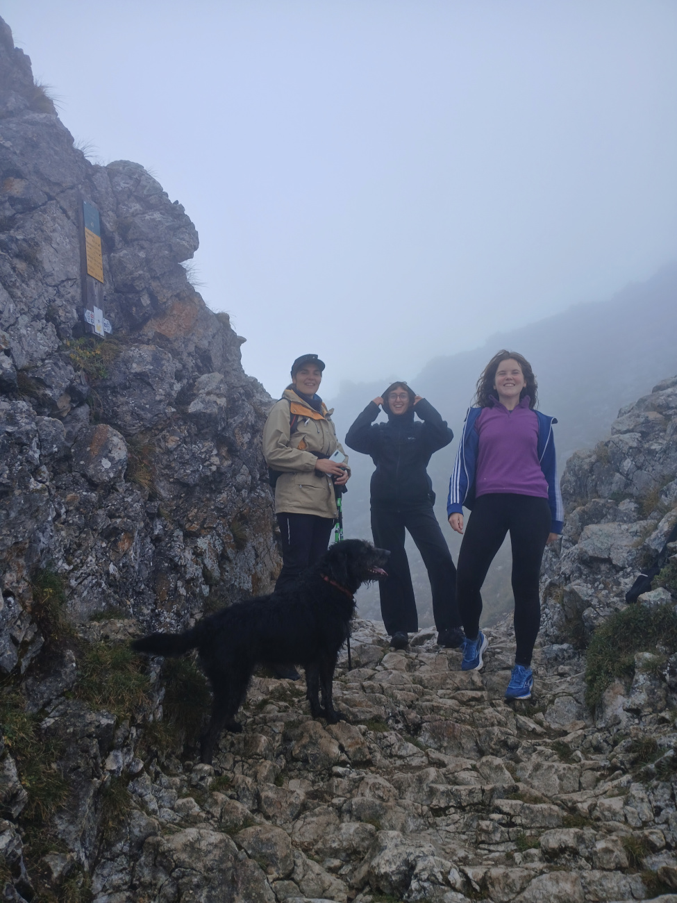 Quant aux arêtes du Gerbier, j’y ai randonné à plusieurs reprises, avec des groupes différents. Le premier comptait Agathe et sa chienne Lola, Marie et Louise, ci-dessous (il manque Éléonor sur la photo). Départ à 6h du matin, dans la nuit, avec nos lampes frontales.