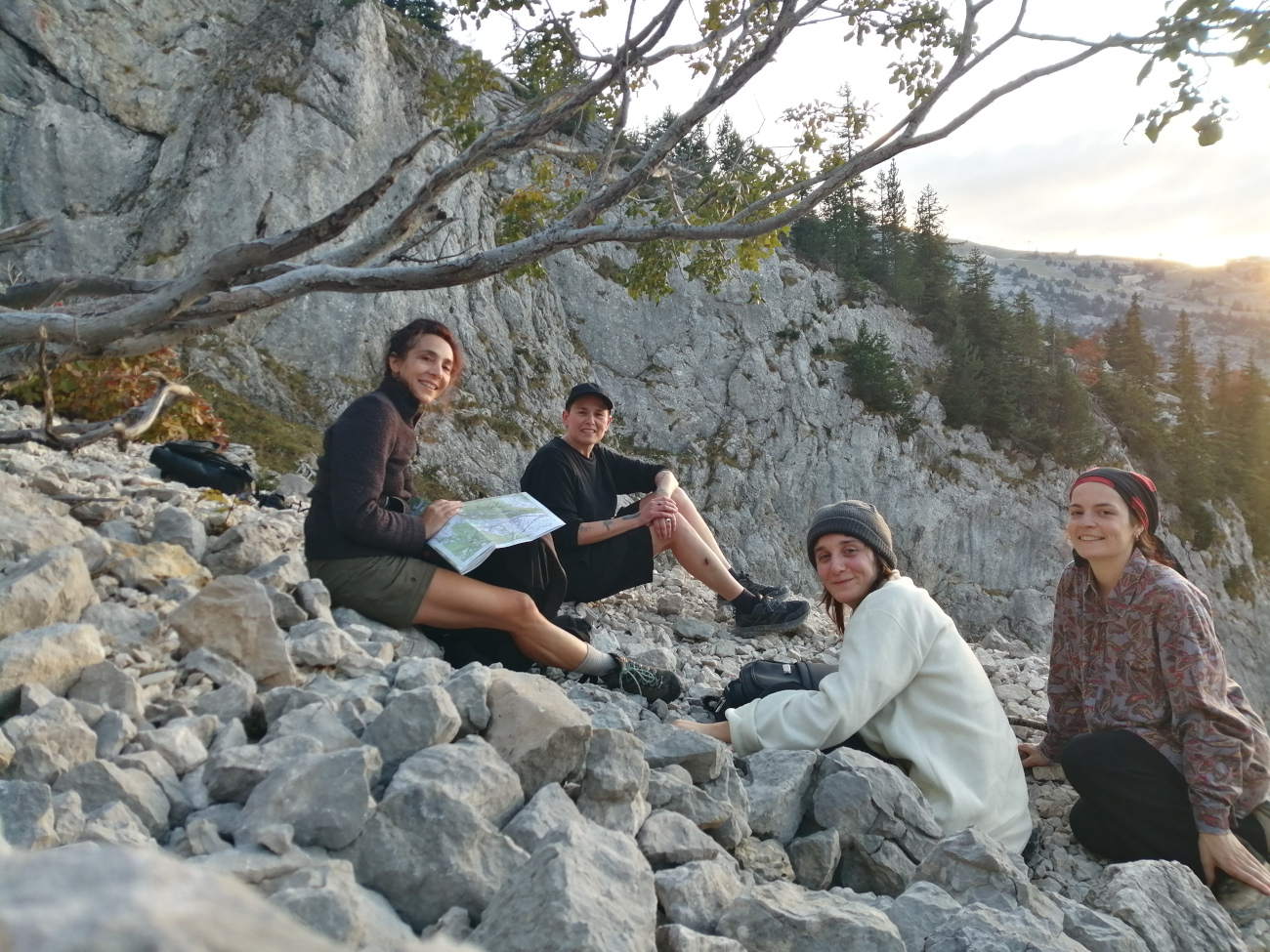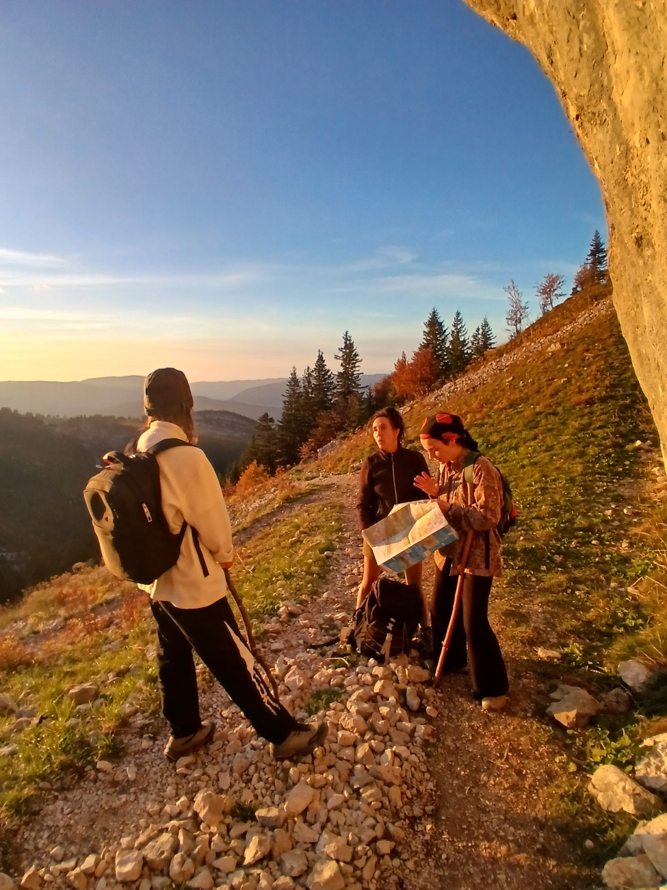 Pour une autre rando, à l’inverse, nous sommes parties en fin d’après-midi pour le Pas de l’Oeille et sommes redecendues dans la nuit noire, pour finir avec une lampe pour quatre parce que nous sommes des dilettantes. De gauche à droite sur la photo ci-dessous, Éléonor, myself, Maélys et Eva.
