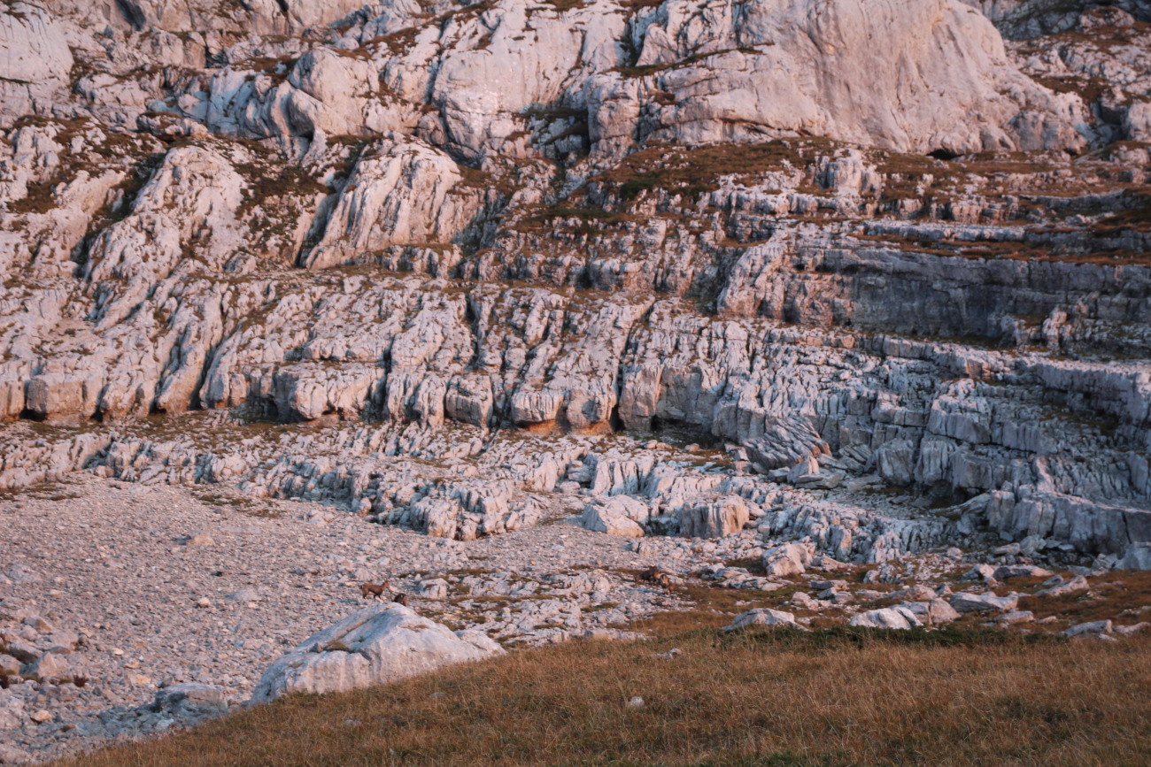 Si vos yeux sont bons, vous verrez sur la photo ci-dessous des bouquetins qui vivent en paix (aux loups près), là-haut, à 2000 mètres.
