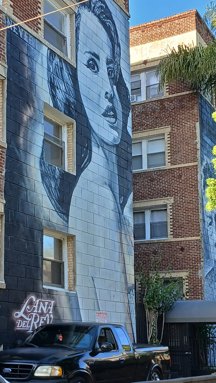 Pour me rassurer, j’ai commencé par aller faire mes courses à Trader Joe’s ; ce n’est pas posh, j’y croise des vraies gens et ça me rappelle Silverlake (même si celui de Silverlake est bien plus agréable et lumineux) et puis faire les courses au supermarché me rassure – j’aime les supermarchés, c’est comme ça. Pour entrer dans ce Trader Joe’s, il faut prendre un ascenseur qui donne directement sur le trottoir (les citoyen-nes respectables se garent sur le parking au premier étage) ; je ne trouvais pas la porte du supermarché et une dame mexicaine qui balayait le trottoir m’a expliqué la chose avant que je lui demande quoi que ce soit, elle était souriante et j’ai eu envie de pleurer. Quand je suis rentrée au Airbnb, deux écureuils se sont battus dans la cour commune de ce mini trailer park aux allures de train fantôme à l’abandon et se sont poursuivis dans un arbre, puis sur le toit de ma cabane rustique graisseuse. J’ai décidé d’écouter Lana Del Rey en marchant parce que sa voix m’est un pansement et, tiens, d’aller voir Lana Del Rey dont on trouve un mural géant à Venice. Merci donc à Lana (en plus, c’est l’un des personnages principaux de mon roman).