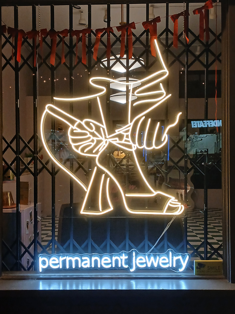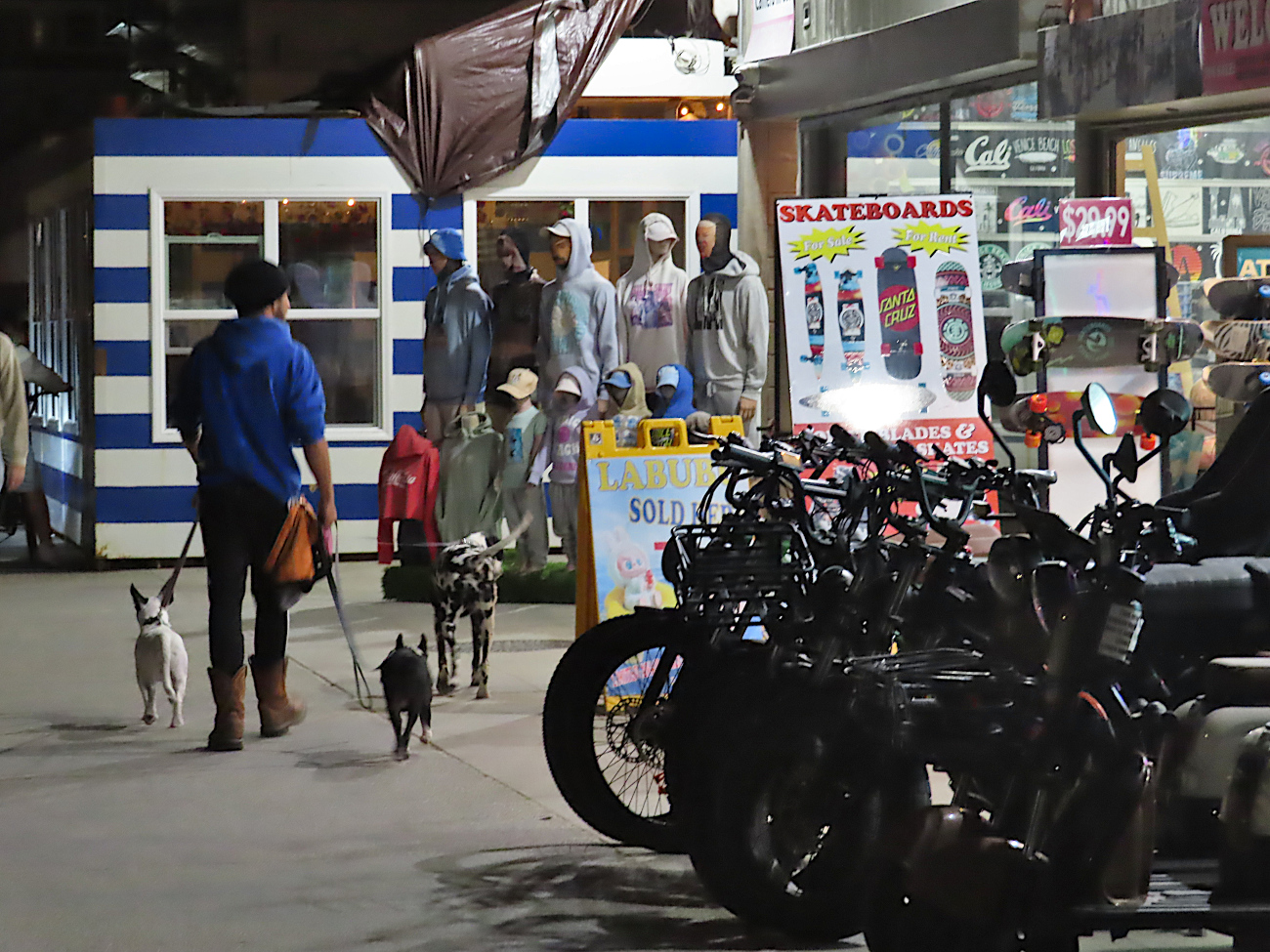 En plus, la ville sent mauvais. Pas seulement mon Airbnb, qui doit être le seul taudis des alentours, mais toute la ville et même la promenade – jusqu’à Venice, à vrai dire. Je ne sais pas ce que c’est que cette odeur, je ne saurais pas la décrire, mais je peux juste dire qu’il m’est difficile de m’alimenter ici parce que je trouve que tout prend l’odeur de la ville, même les avocats. J’en ai au frigo et rien que d’imaginer en couper un, j’ai la nausée. Pourtant tout veut faire beau et festif : tout pour le fun et le self-care (« self-care is hot », lit-on sur une vitrine, « we rent fun », clame une autre). Une vue du centre-ville, que gâchent de stupides guirlandes.