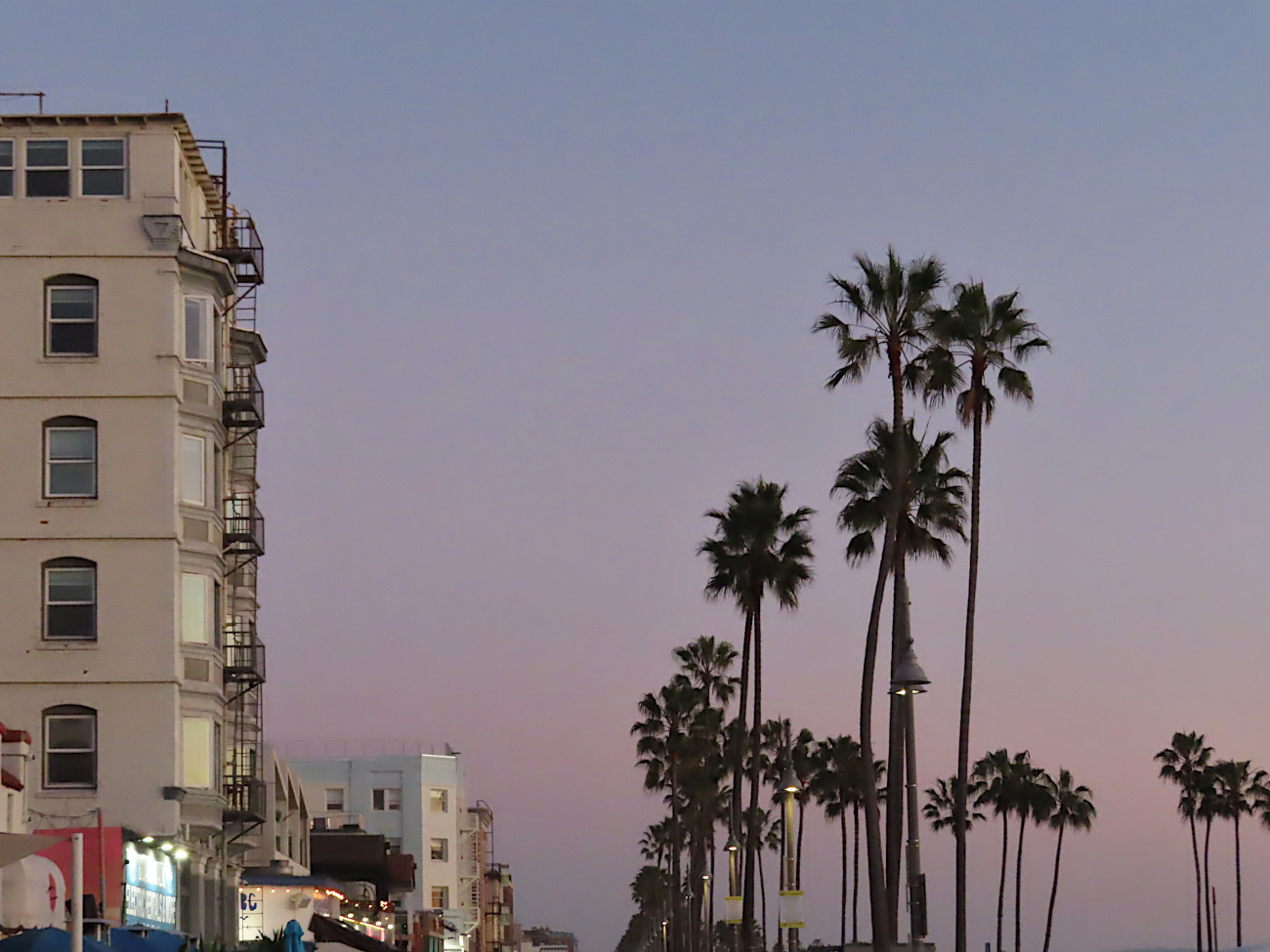 Je n’ai pas grand chose à raconter aujourd’hui. Je déprime un peu d’être ici et je ne me suis sentie bien que quand je travaillais à la bibliothèque, cet après-midi de 14 à 17h, ensuite de quoi je suis descendue voir le coucher du soleil, qui était aussi beau que d’habitude, puis faire des repérages à Venice pour la scène finale de mon roman – je devais y aller quand il faisait totalement nuit et en effet, l’ambiance n’est pas la même. Surtout un vendredi soir : on ne le voit pas sur les photos ci-dessous mais le boardwalk de Venice doit être la zone la plus fréquentée de L.A. le week-end, les films ne mentent pas à ce sujet. Quelques photos malgré mon humeur maussade. Pas de vues de mon footing parce que ce n’était pas mémorable ; j’ai d’abord essayé de courir sur l’esplanade avec les Musclor et les queues de cheval mais je n’ai jamais eu aucun plaisir à courir en meute aussi j’ai bifurqué au bout d’une demi-heure, d’ailleurs le soleil tapait déjà trop fort et j’ai cherché l’ombre sur les collines. On atteint les collines en passant dans un tunnel sous la Pacific Coast Highway (parce que, oui, à L.A. on court dans les gaz d’échappement, en bordure d’autoroute – que soit à la plage ou le long de la L.A. River) puis en montant un escalier comme la ville en regorge. Je n’aime toujours pas Santa Monica ; je trouve d’une grande justesse le mot employé par l’amie de JP pour la décrire : stérile, oui. Mais aussi pathétique avec ses boutiques de luxe, tout pour les animaux-objets, tout pour les chakras, tout pour les ongles ; il y a même des boutiques où des gens prennent des bains bouillants dans la même pièce, on peut les voir depuis la rue (je le jure) et d’autres qui proposent des bijoux permanents. Les gens sont absolument horribles et grotesques et antipathiques.
