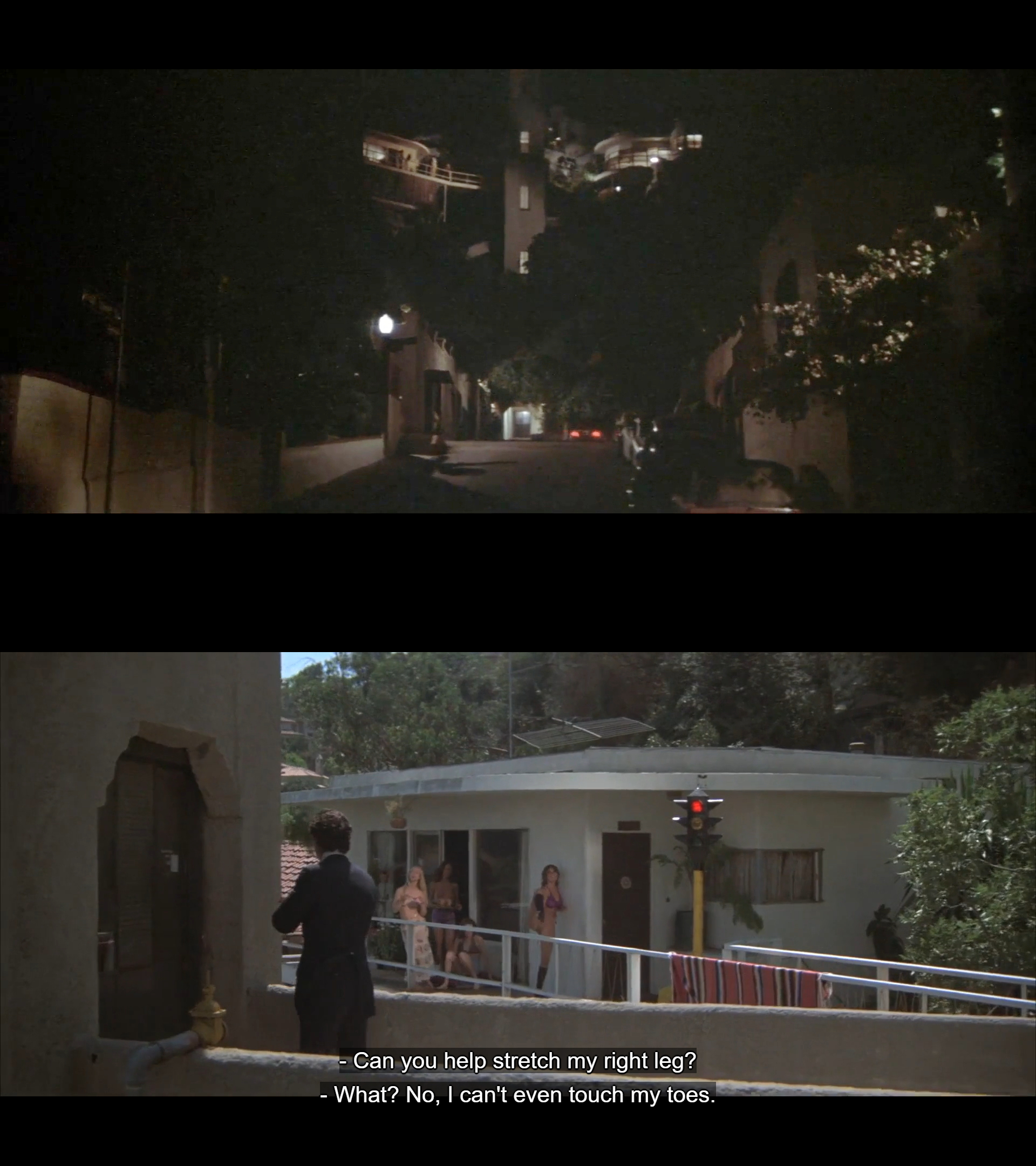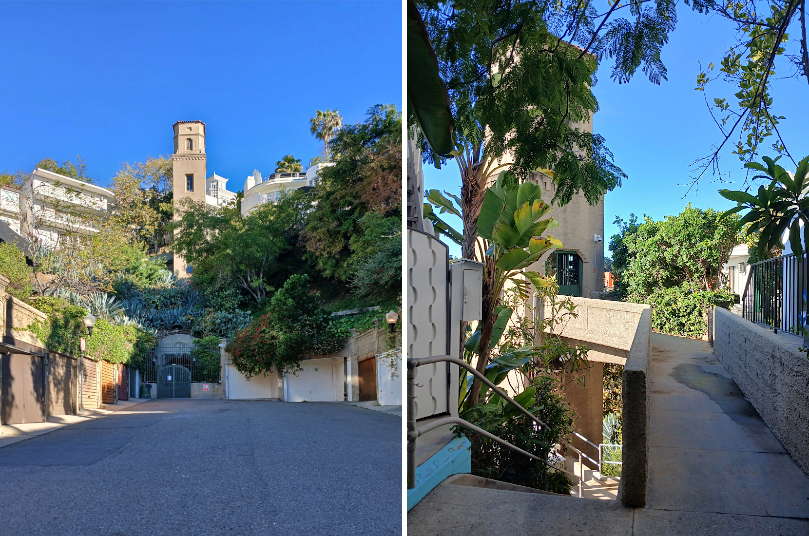 Ce matin, je suis allée voir le bien nommé High Tower Drive, au numéro 2178 duquel vit Eliott Gould dans The Long Goodbye (Le Privé en VF) de Robert Altman (1973). J’ai un peu éclairci la première image pour la rendre plus intelligible. Sur la deuxième, on voit Eliott face à la porte de l’ascenseur.