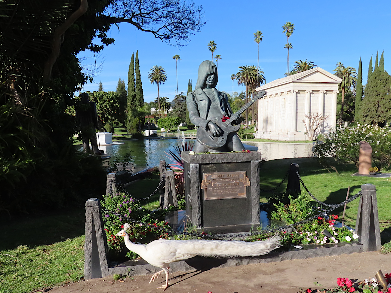 Dans le cimetière des stars, je pensais voir la tombe de Liz Taylor. J’aurais aimé lui dire merci, pour les films inoubliables, pour la grâce, pour son soutien à la communauté LGBT. Elle est enterrée à Glendale, en fait. Mais j’ai vu des tortues aquatiques, des canards noirs américains aux magnigiques reflets bleu nuit, des écureuils comme partout ailleurs, des chats errants, des paons et, juste avant de partir, un paon blanc, qui passe ici devant la tombe de Johnny Ramone.