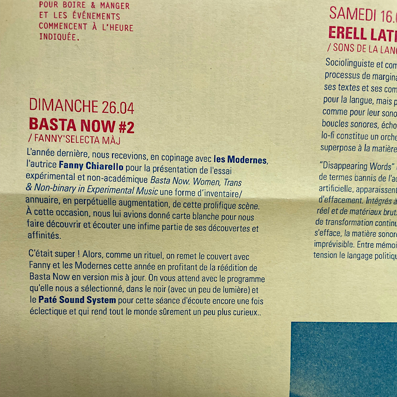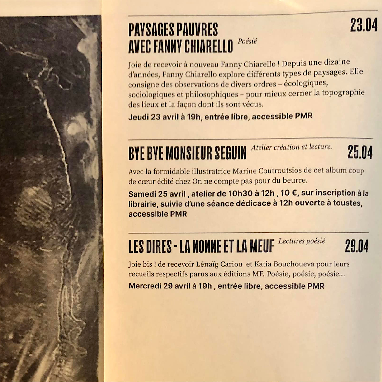 Je suis très heureuse de retourner à Grenoble, après cinq mois d’absence, et d’y retrouver quelques amies très chères. Le jeudi soir, je lirai des extraits de Paysages pauvres aux Modernes et le dimanche soir, je proposerai une nouvelle séance d’écoute au 102 – 1h30 d’une sélection musicale éclectique dans la pénombre, avec un entracte. Voici les visuels qu’on m’a envoyés – il est assez émouvant que j’y côtoie mes amies Katia Bouchoueva et Lénaïg Cariou sur le programme des Modernes, et la camarade Erell Latimier sur celui du 102 (pour mémoire, Delphine Dora et moi avons fait un entretien croisé avec Aude Rabillon et Erell dans le dernier numéro de Revue & Corrigée). Merci à Gaëlle et Samson pour leur invitation <3 <3 <3