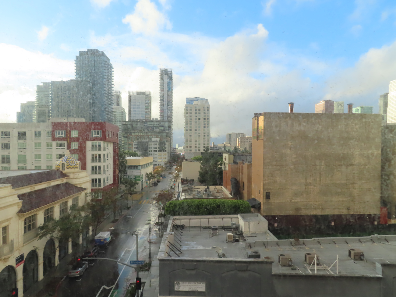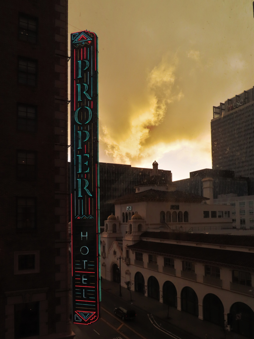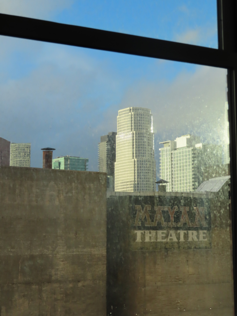 Je n’ai pas grand chose à montrer aujourd’hui. J’aurais pu prendre de superbes photos sous le déluge mais si j’avais fait ça, je n’aurais plus d’appareil photo – ou de téléphone portable. J’ai quitté mon antre de Santa Monica juste à temps ; ma nouvelle amie Kathryn est venue me chercher en voiture sous la pluie torrentielle alors que dans l’antre, le toit commençait à fuir, il gouttait à trois endroits différents, deux auprès de prises de courant. Sur l’autoroute, des mares géantes occupaient parfois plusieurs voies, les véhicules en décrochaient des gerbes d’eau spectaculaires et sur les voies de droite, certains avaient de l’eau jusqu’aux portières. C’était très impressionnant. Nous avons déjeuné dans un très chouette petit restaurant vers Echo Park et nos discussions m’ont vite fait oublier Santa Monica. Je ne remercierai jamais assez Kathryn pour sa présence – la qualité de sa présence, sa douceur, la richesse de nos échanges. Puis je suis arrivée à mon hôtel et quand je suis entrée dans ma chambre immaculée, délicatement parfumée, au cinquième étage, j’aurais pu pleurer. Quand il s’est arrêté de pleuvoir, je suis sortie faire un tour dans les rues plus désertes que jamais de Downtown (jour férié de déluge oblige) et une fois de plus j’ai été fascinée, soulevée, bouleversée par cette splendeur décadente. Je me suis arrêtée faire quelques courses et suis rentrée du supermarché sous une pluie battante qui a duré tout juste le temps de mon retour à l’hôtel – je ne peux pas consulter la météo heure par heure, voyez-vous, sinon j’aurais attendu à l’abri en prenant des photos. Malgré ma cape de pluie, la moitié de mes vêtements est en train de sécher dans la salle de bain et j’ai l’impression de gâcher la délicatesse des lieux. Comme si la poisse de m’être pris cette averse était un résidu de la crasse de SM que j’amènerais avec moi dans ce bel hôtel très chic. Quand je suis sortie de la salle de bain, la chambre était inondée de lumière.